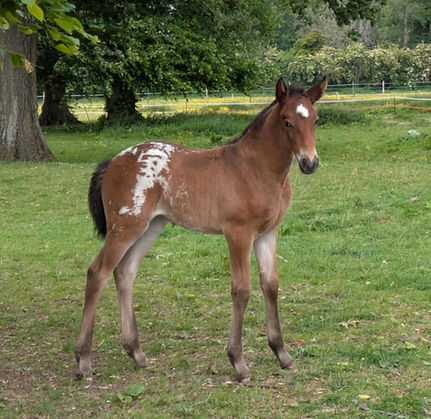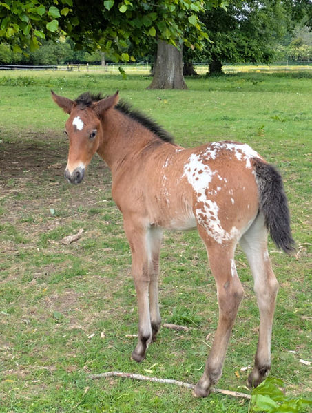 Waterbank Estrela (Star) Bay based blanket spot filly born 30/04/25 out of 155cm KNN graded purebred Knabstrupper of classic type, Waterbank Sirani by 163cm Graded Lusitano stallion Furo.